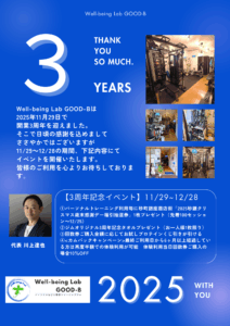 Well-being Lab GOOD-Bはこの度2025年11月29日で開業3周年を迎えることができました。